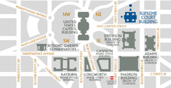 The main entrance to the Supreme Court Building is on the west side, facing the United States Capitol.
